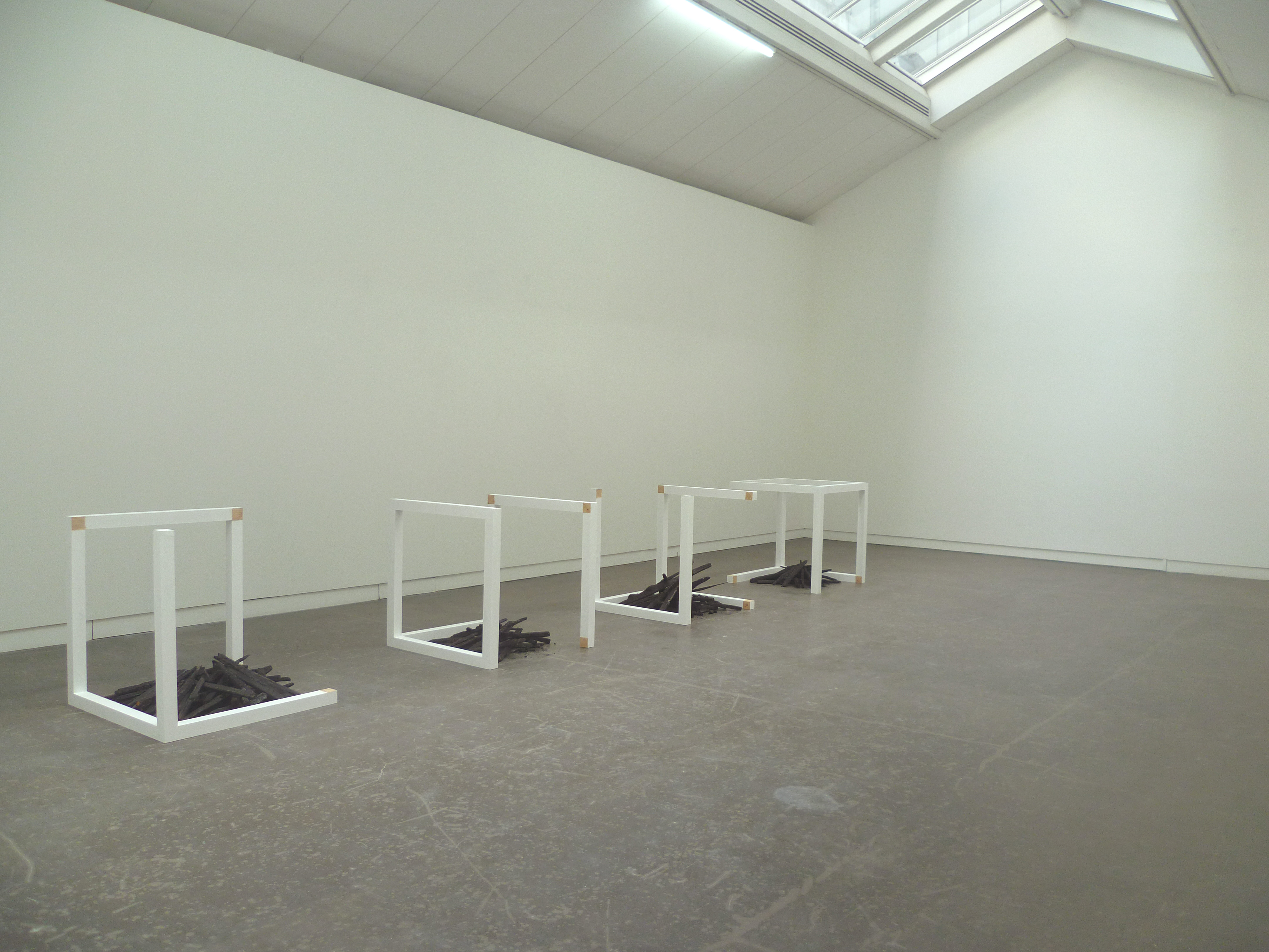 One of a number of works which explore the relationship between ritual and Conceptual and Minimal art, here, most especially that of Sol Lewitt and his statement, in the first ‘Sentence on Conceptual Art’ (1969) that ‘Conceptual Artists are mystics rather than rationalists.’ This new work takes Lewitt's statement as a means of reconsidering one of his most celebrated works, the serial project Incomplete Open Cubes begun in 1974. Complete open cubes were made and sections then sawn away in order to create particular works from Lewitt's series; the saw marks are clearly visible on the remaining structure. The wood taken from each sculpture was then chopped into firewood, and burned; the burnt remains was then returned to the centre of the sculpture from which it was taken, thereby emphasising the transformative and ritualistic nature of such works.